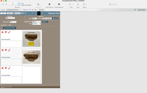 Finds: This is the main Catalogue for diagnostic finds. Each entry offers drop-down options to automatically choose pre-assigned values, e.g., Material < Clay, Metal, Glass, Other, but also boxes to select the Fabric. At this phase, we are still processing the material collected from the surveyed fields and taxonomizing the diagnostics, offering basic information on fabric, preserved dimensions, a brief description, and date. A more systematic study of the characteristic pottery will follow, along with the addition of bibliographical references and other commentary. We decided to process the material in two stages so that we can quickly obtain a chronological horizon of the fields surveyed before proceeding to a detailed cataloguing of finds.
